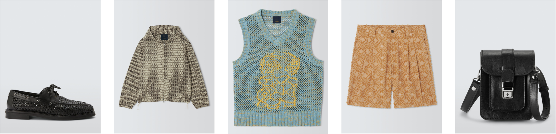 John Lewis x LABRUM Leather Boat Shoe, £99, John Lewis x LABRUM Jacquard Hoodie, £139, John Lewis x LABRUM Knit Vest, £79, John Lewis x LABRUM Jacquard Pleated Short, £79, John Lewis x LABRUM Leather Bag, £179