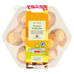 Delicious choux pastry profiteroles filled with fluffy cream, and topped with zingy lemon and Belgian white chocolate fondant with a sweet dusting.